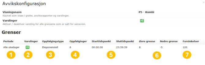 7. Forsinkelse: Angir hvor mange minutter en verdi kan være utenfor grenseverdiene før et avvik registreres og varsles.
